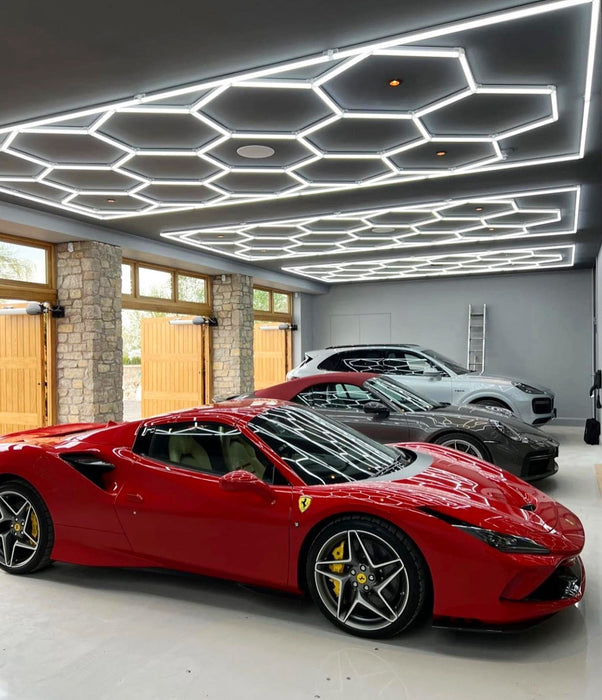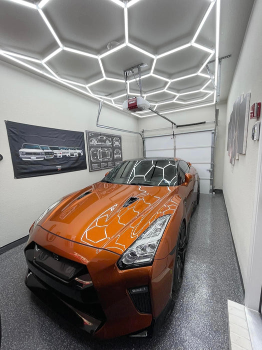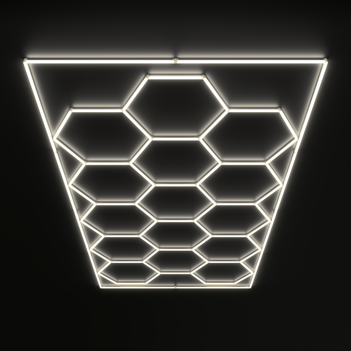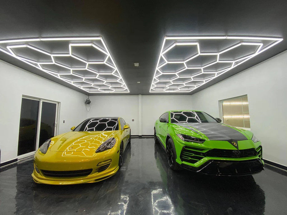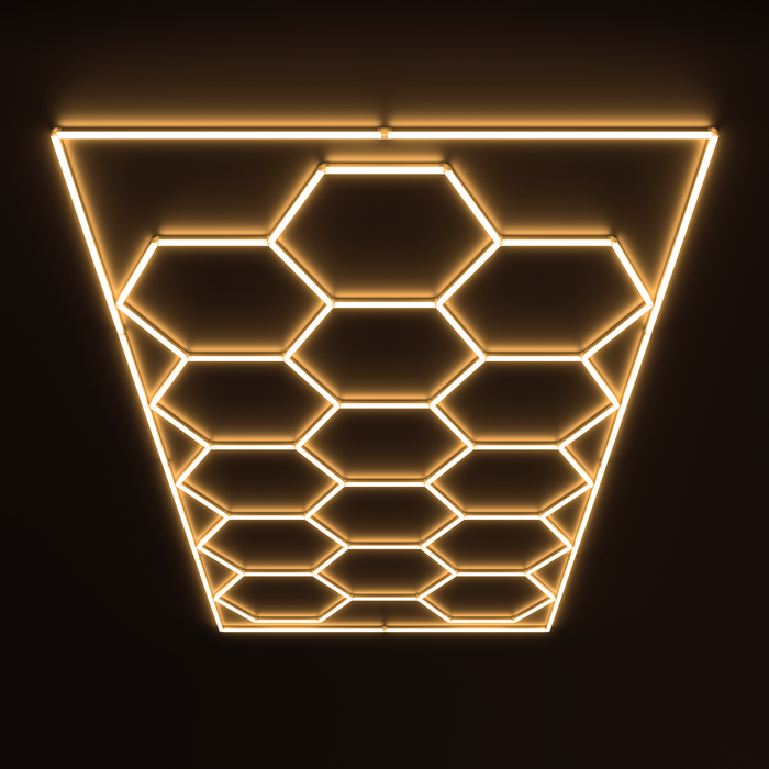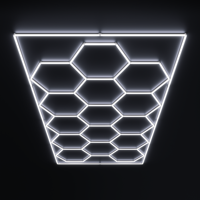 Our most popular and versatile hexagonal lighting kit as seen on Facebook, YouTube, Instagram, and TikTok. 16 x 8 feet with 15 bright LED hex shapes and rectangular border which is easy to assemble and can be hung or suspended to fit any garage, office, studio, or gym space. Made popular in the automotive and detailing industry, HexGlow lights are perfect if you’re looking for a luxurious and modern lighting solution while being very bright and functional!