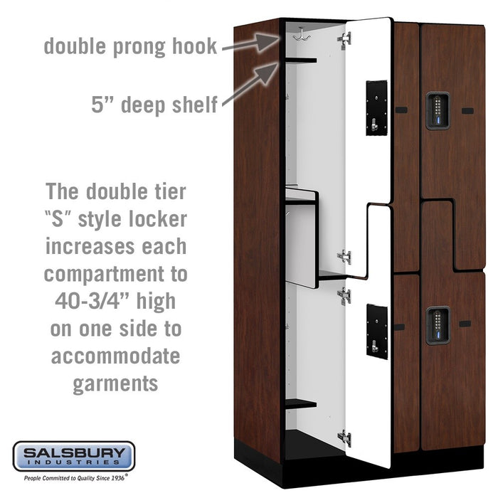 Salsbury 12" Wide Double Tier 'S' Style Designer Wood Locker - 3 Wide - 6 Feet High - 21 Inches Deep - Mahogany - Black Electronic Locks