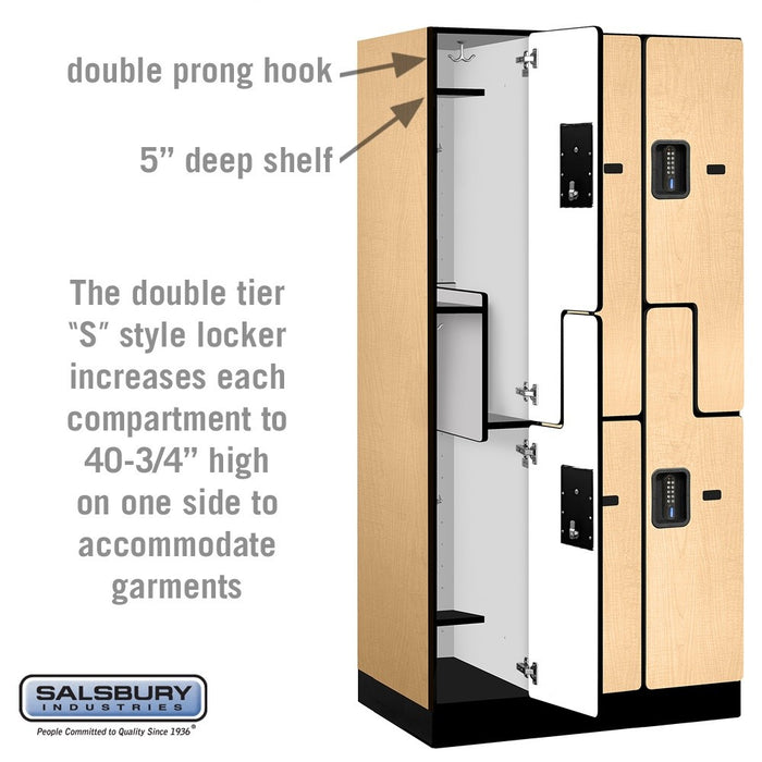 Salsbury 12" Wide Double Tier 'S' Style Designer Wood Locker - 3 Wide - 6 Feet High - 21 Inches Deep - Maple - Black Electronic Locks